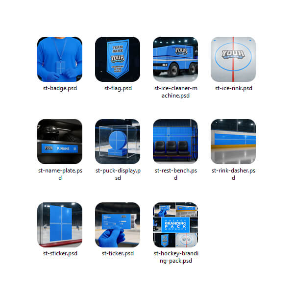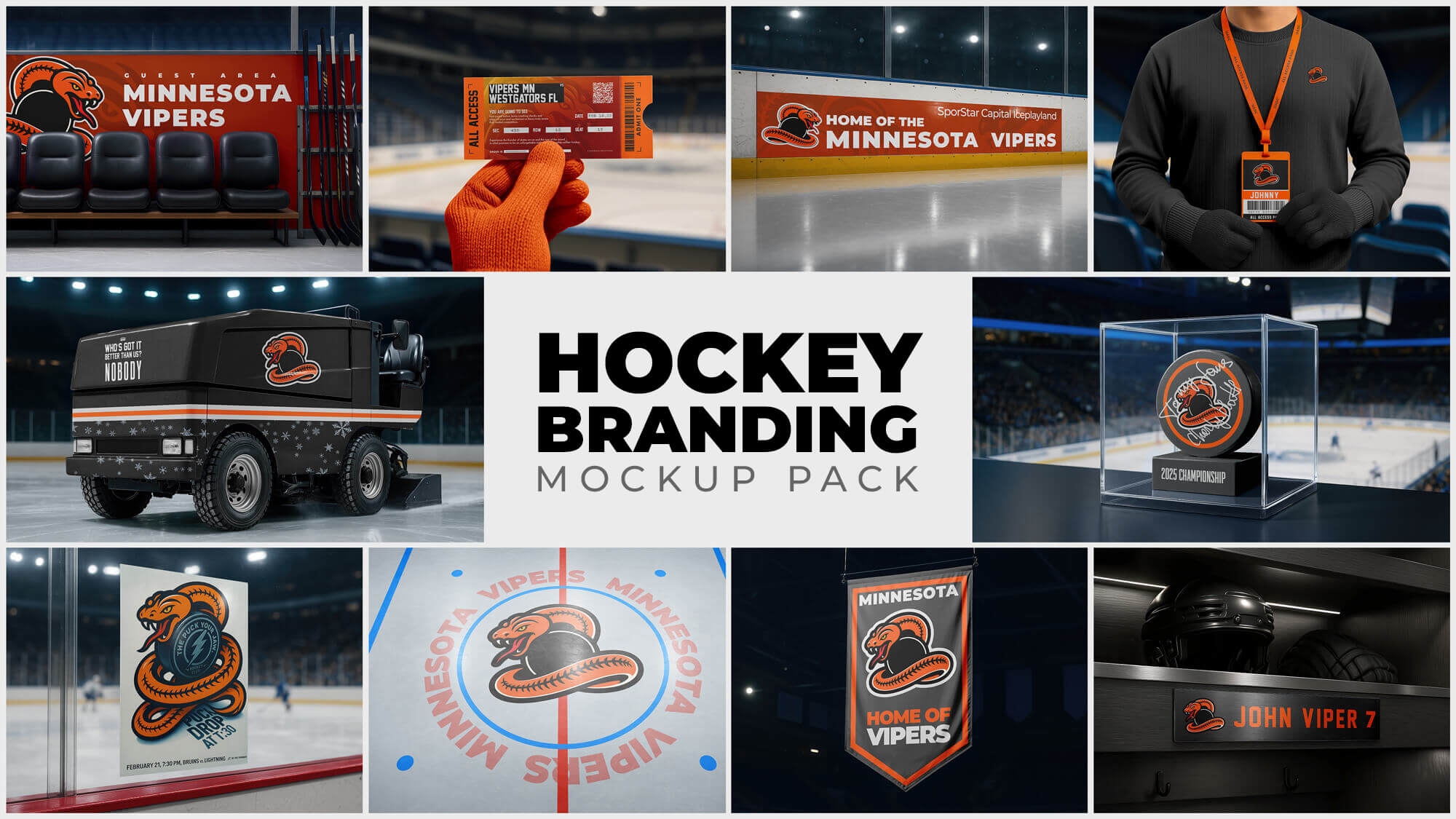 10 total mockups plus 1 psd multi-mockup layout (badge, rest bench, rink dasher, flag, ice machine, ice rink, name plate, puck, poster, ticket).